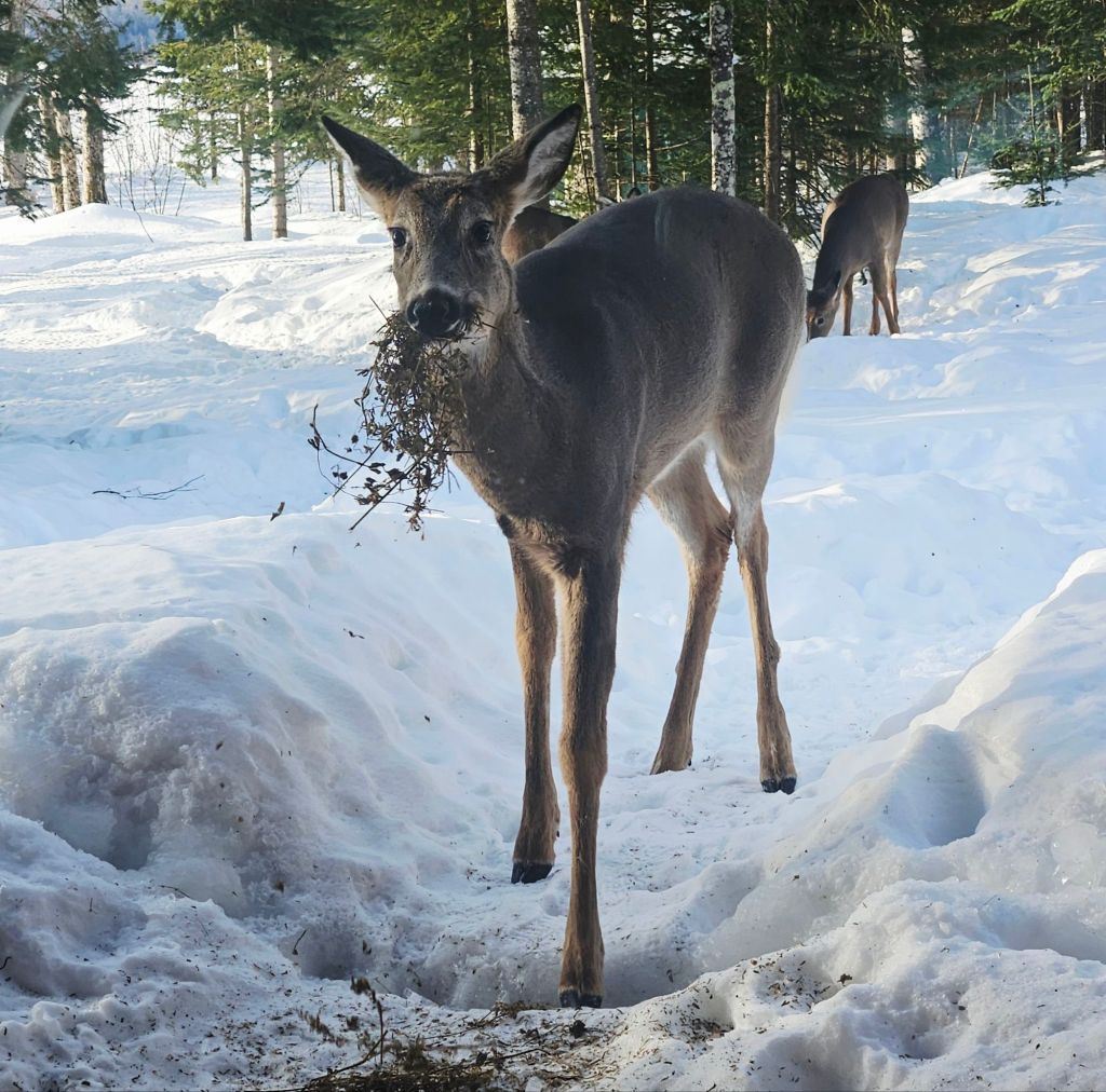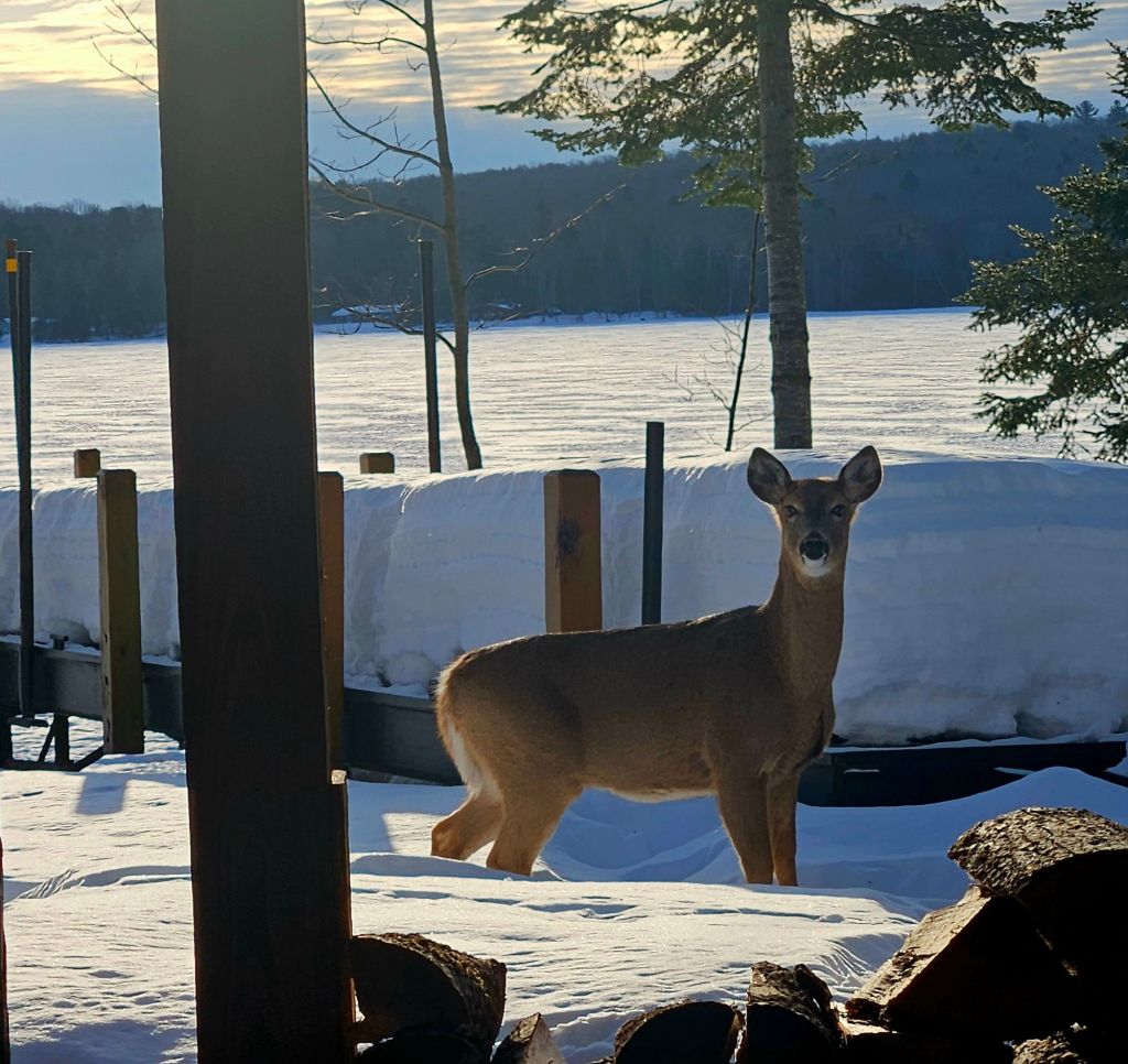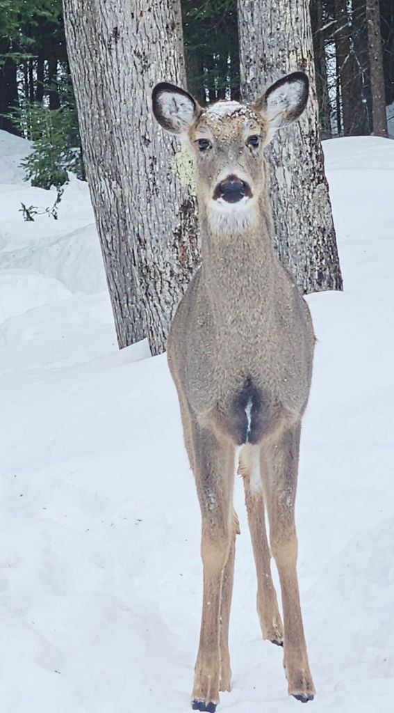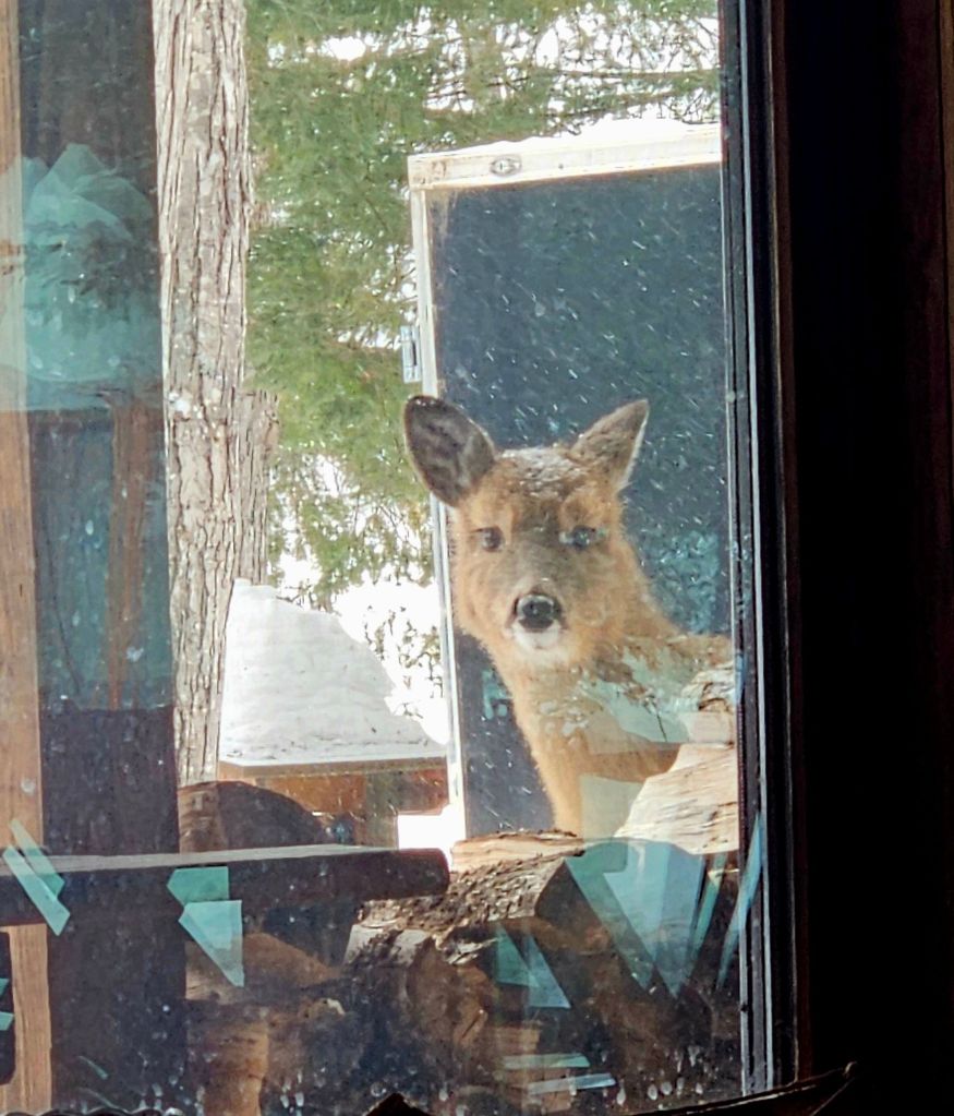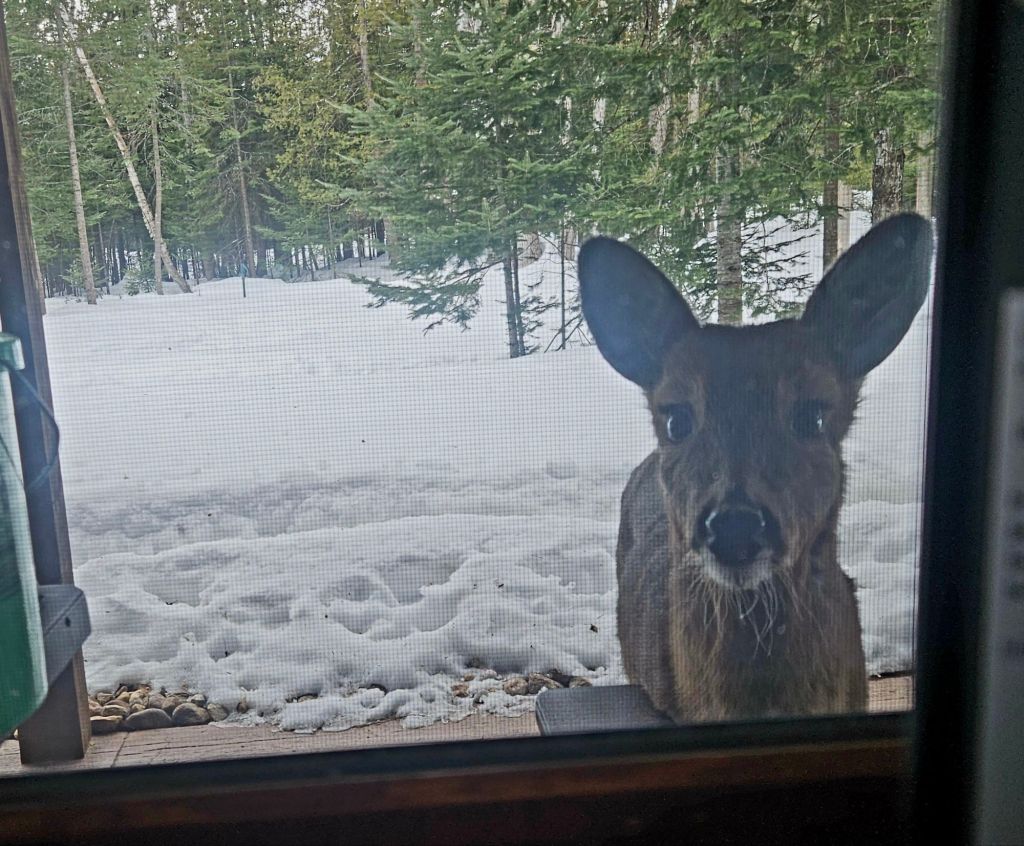 When she looks in on me as I sit on my computer, how can I resist?! By the way, feeding wild deer is illegal in downstate Michigan but not here in the U.P. Regulations vary by region depending on herd health and size.The snow on the roof is starting to shrink now that March is here, and I’m mindful when to stop feeding. I’ve also heard that once wild deer are dependent on you as a food source, you need to keep it up through winter. Hmm. They will probably head into the woods as their natural food source emerges.