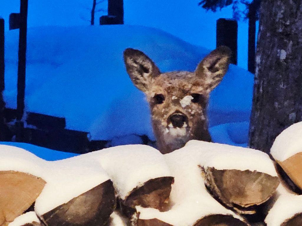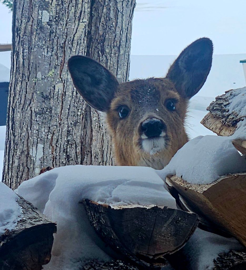I started to put food on top of the wood for her, since she has to compete with older deer. She learned quickly, and goes there regularly now.