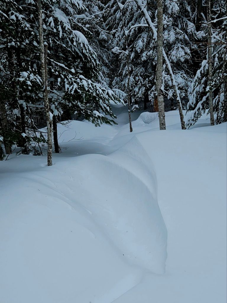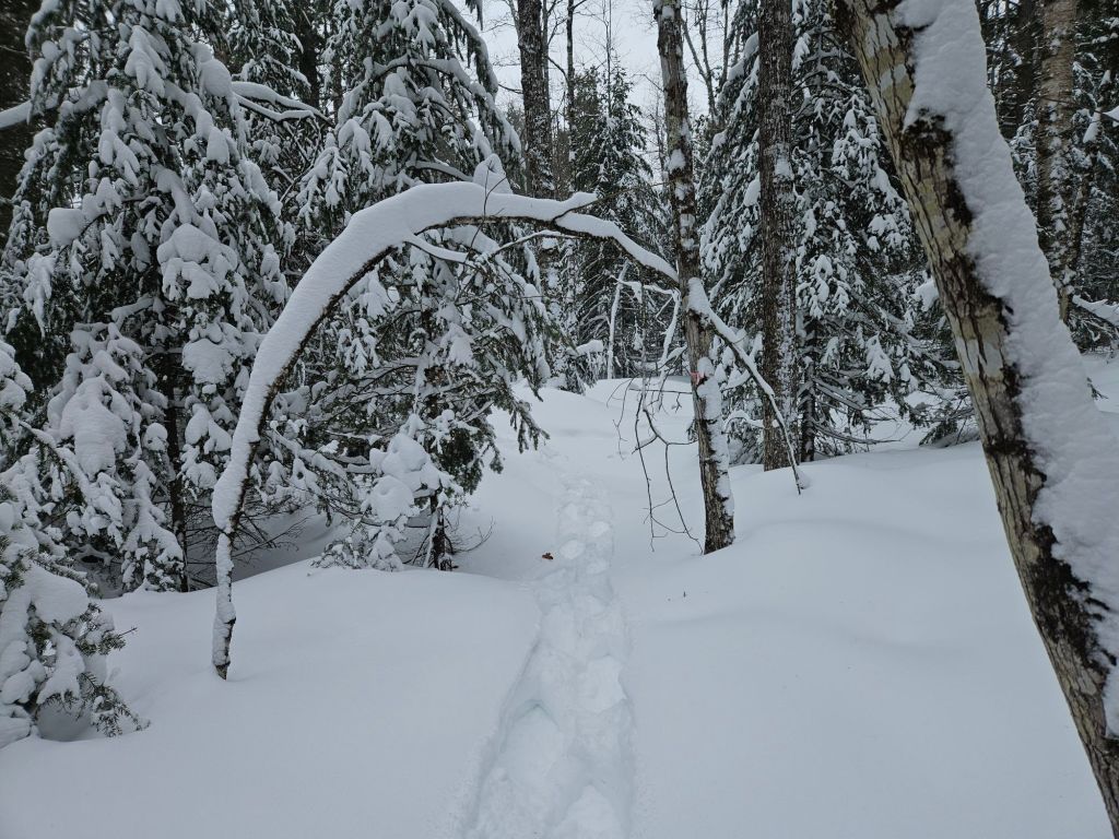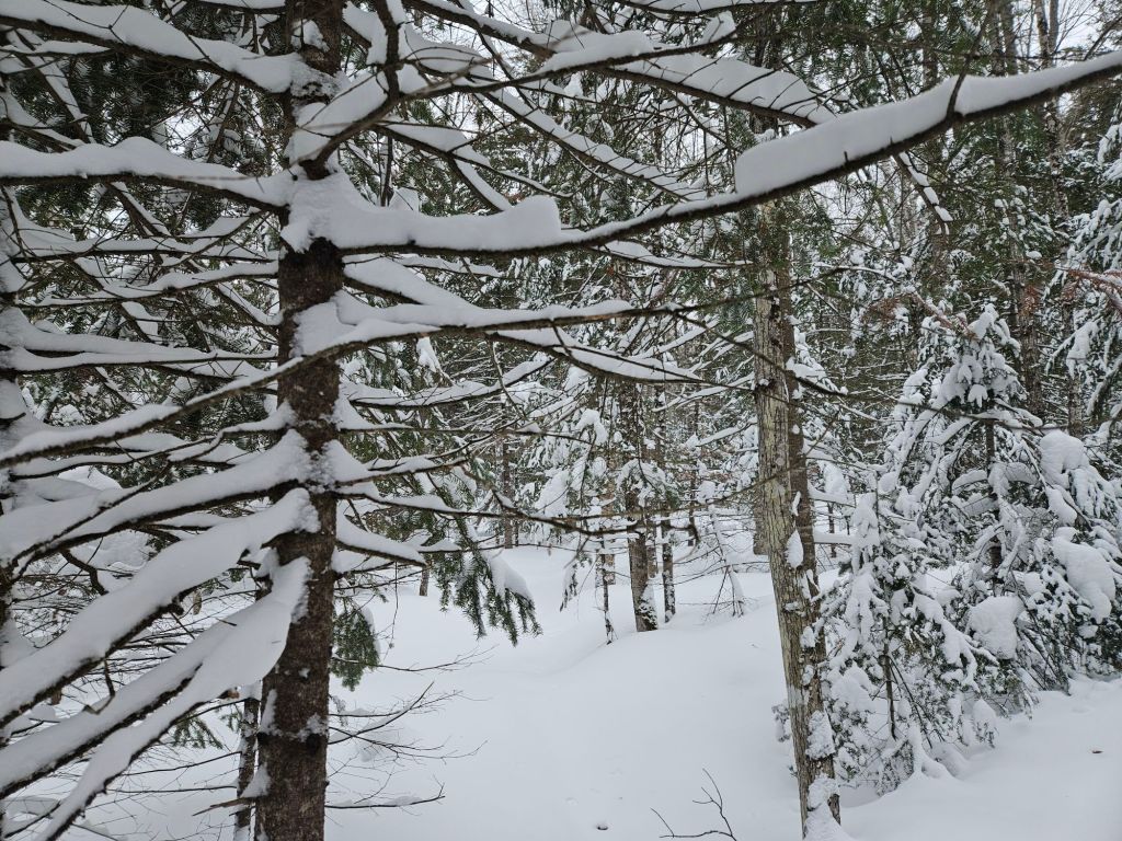 You can tell the wind wasn’t strong in the woods because snow still clung to the branches.