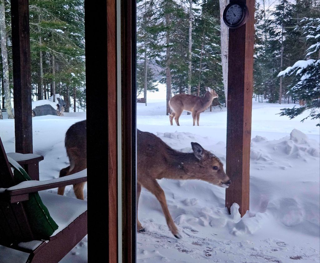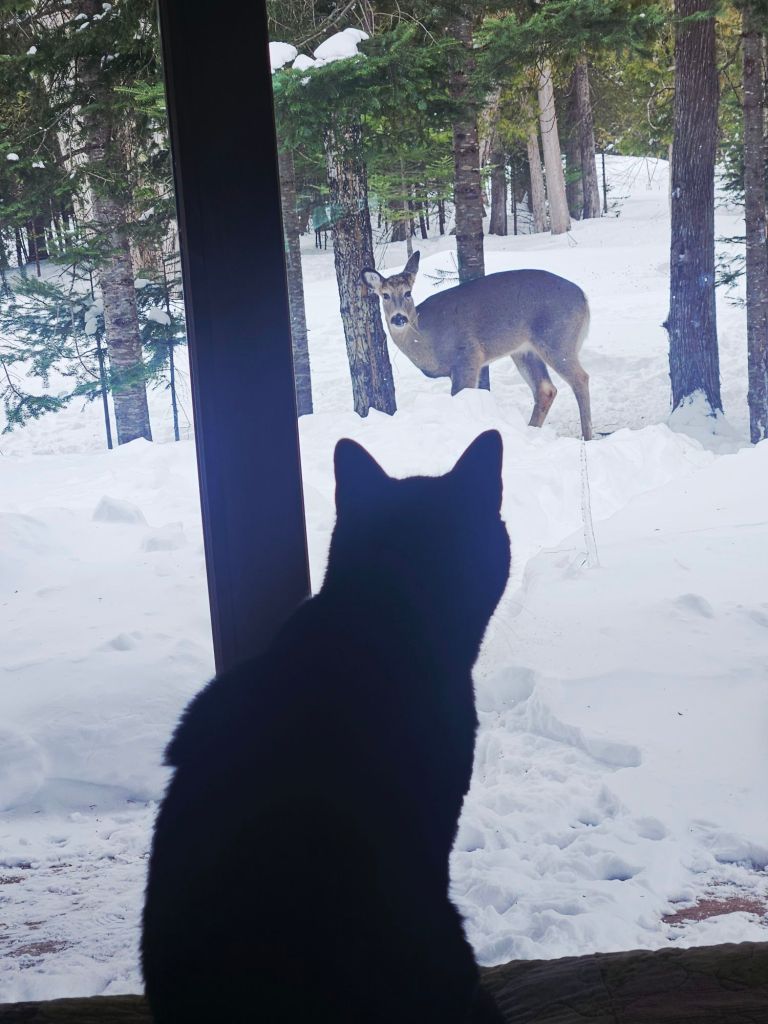 Boo seemed undisturbed by the storm, or the ever-present deer. She generally ignores them, but eyeballed this one while sitting on the bed. I suppose the height gave her a better view. The remaining photos are more of “my outdoor pets,” especially the fawn who stays close.