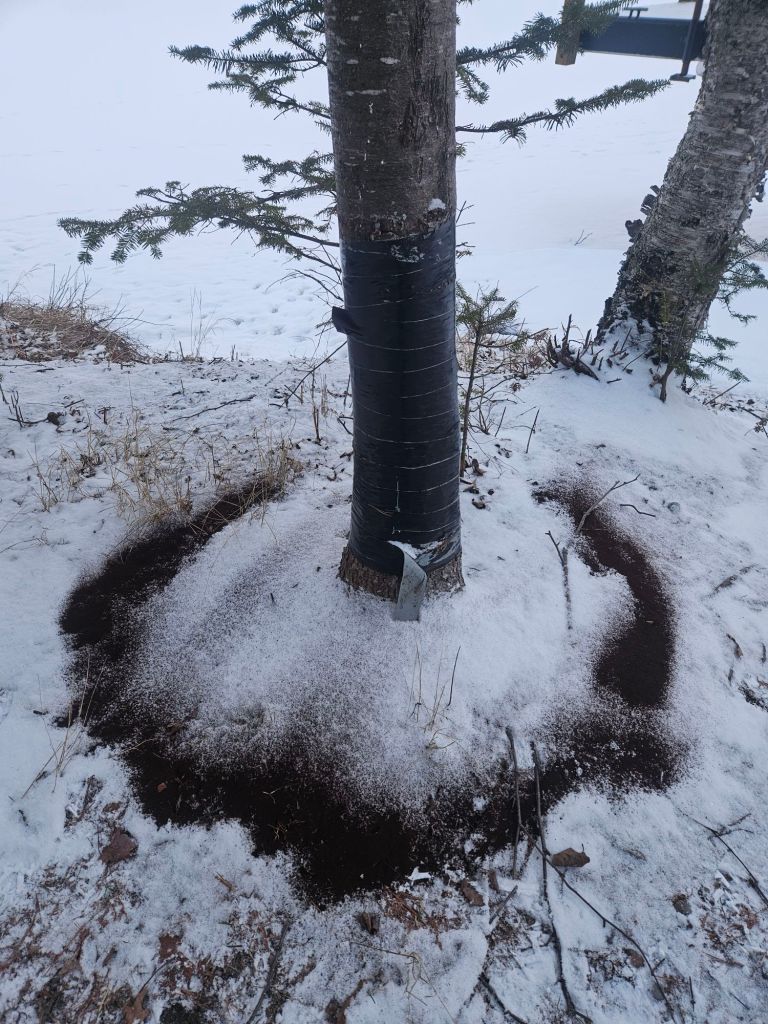 To answer a question in the last post, here’s what I do with dried coffee grounds….add a little acid to the soil around evergreens. Who knows if it helps, but it’s easy to try. And it gives me somewhere to put the grounds. I research which plants like wood ash and which like coffee grounds as the experiment continues. (This spruce still wears a bandage after being injured by a vehicle.)