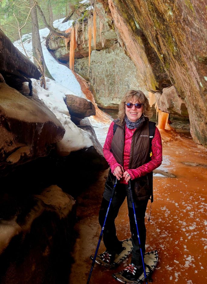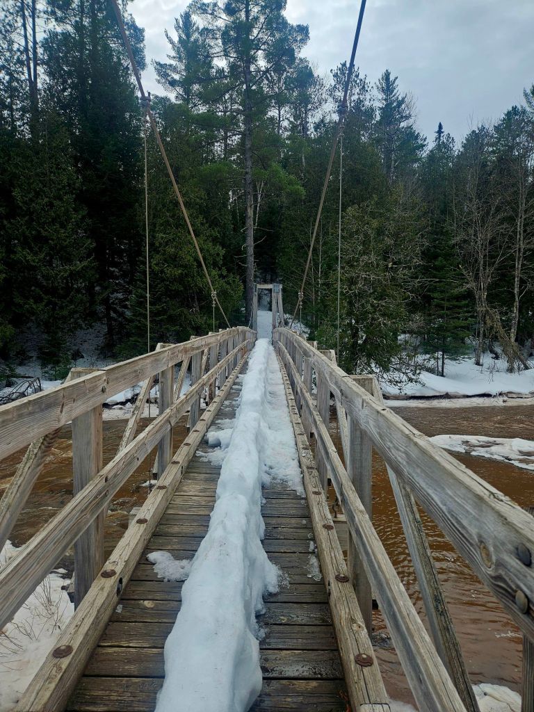 By this suspension bridge. I wobbled across on my snowshoes, on top of that snow ridge in the middle. (Just for fun. I enjoy balancing challenges.) Others walked in regular boots along the side.