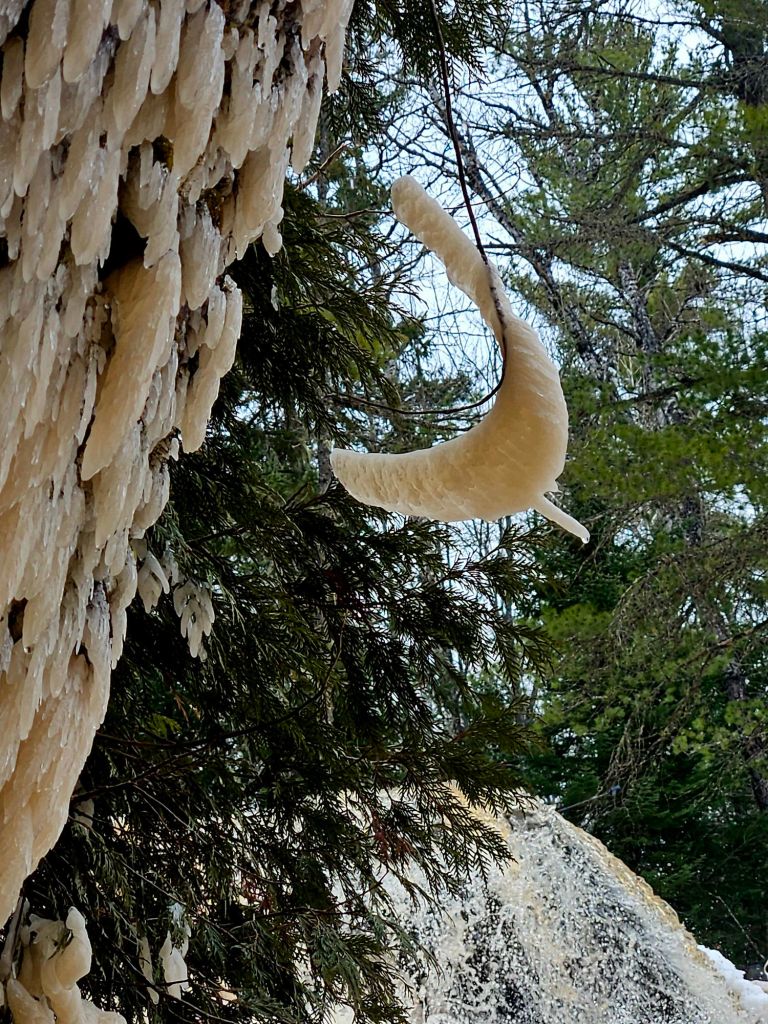 I don’t remember much from chemistry class. I wish I did. How does moving water turn into ice? How does it create such amazing structures? Those are the questions that arise when you visit O Kun De Kun Falls in Michigan’s Upper Peninsula at the end of March. More photos and thoughts below…