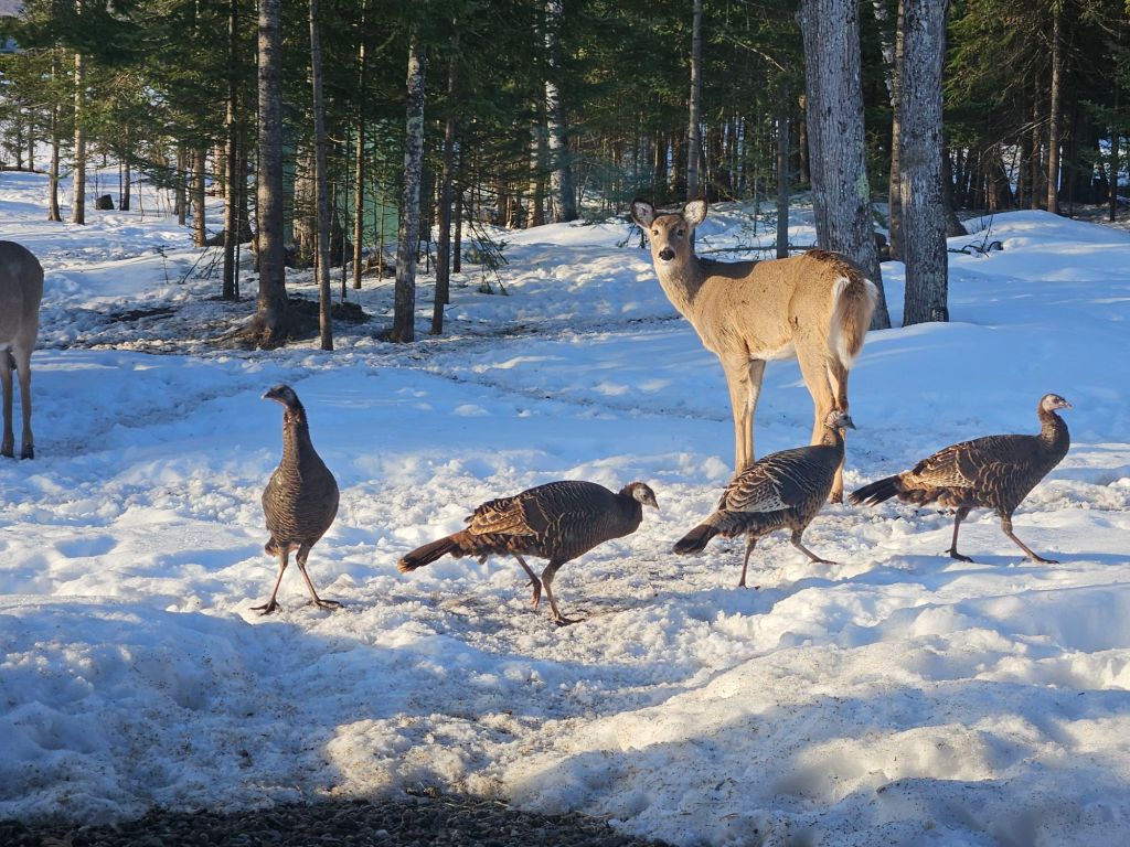 Back home at Camp Many Moons, turkeys have joined my wildlife menagerie. Deer and turkeys live peaceably side-by-side. (Some species get along better than some political parties these days!)