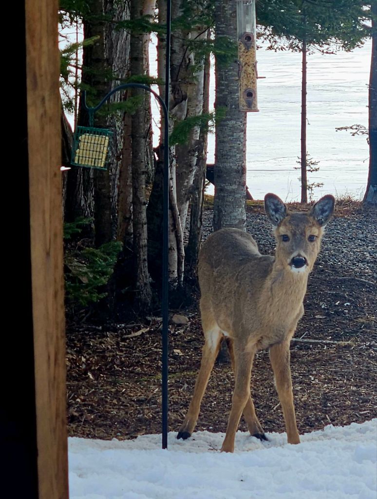 My “favorite” has begun to explore the spillover from the bird feeder. I’ve discovered “she” is a “he,” as the buds (bumps on the skull that will turn into antlers) have emerged. This means he’ll be targeted by hunters before long. Enjoy life while you can, little one! Extra treats for you!