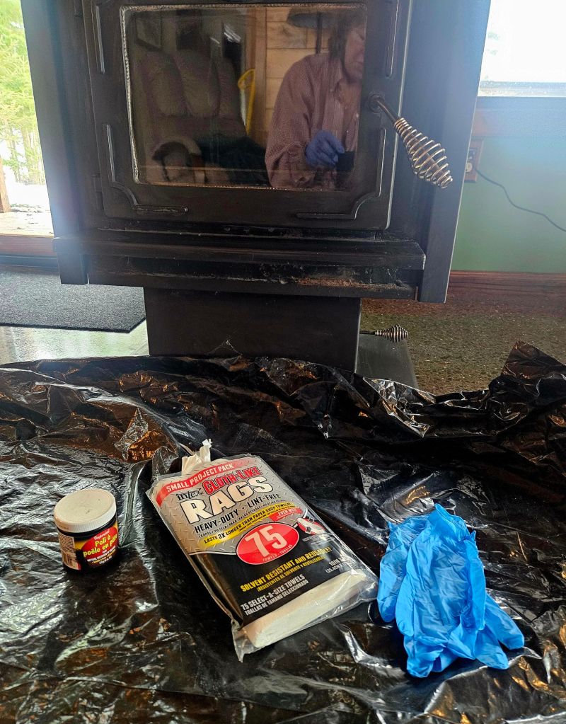 Indoors, I’ve continue the project mentioned in the last post–refurbishing the old woodstove. The glass is clean and the gasket is new, so polishing was next…a messy business requiring gloves.