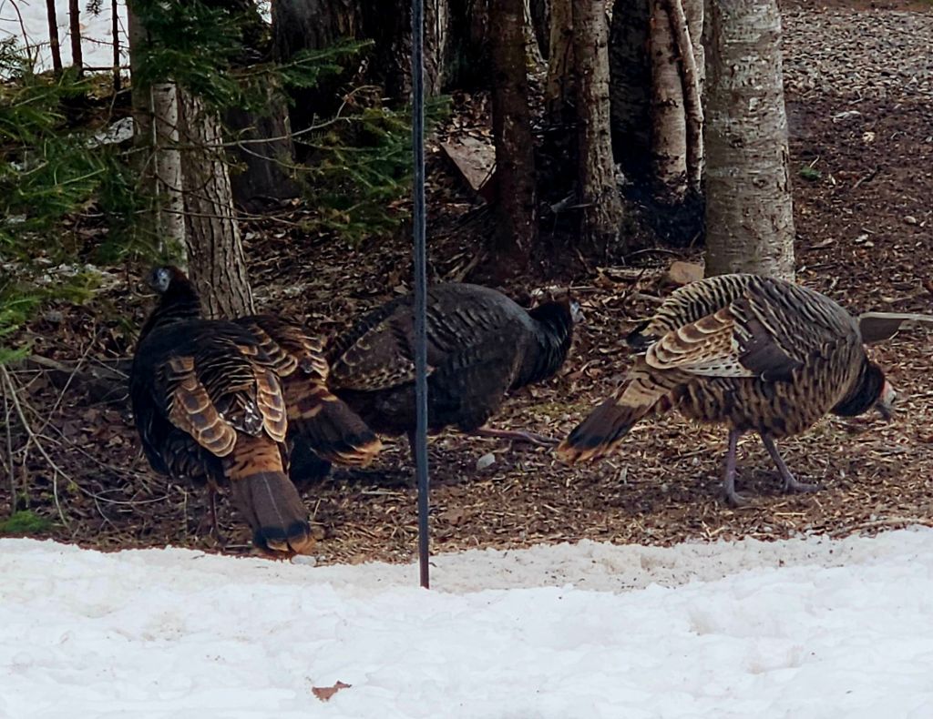 The turkeys forage under the bird feeder also. I like having them around as long as the flock doesn’t grow. It’s enough to keep up with deer poop–I don’t want to tackle turkey poop, too.