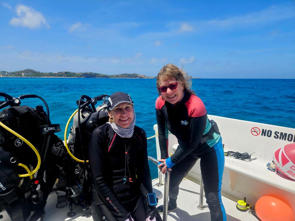 We began diving on our first morning. We boarded the dive boat from the shore, always asking the crew to load smaller tanks for us. (Most divers use this size here, but smaller ones are easier on small frames. They carry less air, so you have to be good with air consumption. We are.)