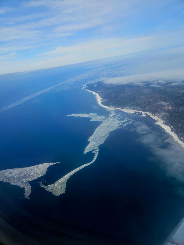 …this was the view as we prepared to land on the Keweenaw Peninsula in Michigan’s Upper Peninsula, where ice still floated in Lake Superior.