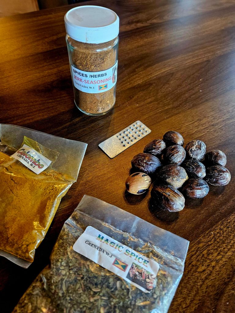 So about those spices that give the island its nickname. It’s called “Spice Island” because it’s a major produce and exporter of spices, especially nutmeg and mace. It became a “spice center” while a British colony. In the 1700s and 1800s, nearly 130,000 enslaved Africans were brought to the island – like elsewhere in the Caribbean – and mixed with the indigenous people from South America called Caribs. (Thus, the word “Caribbean.”) That’s who worked the spice plantations. Happily, the locals in the spice market who sold me these are free people…but probably descended from slaves. The proprietress convinced me I need her “magic spice.” Now, to figure out how to use it! I bought the jerk spice because I learned to love it while living in Cuba. I took some nutmeg seeds (huge!) and a micro-planner to grate them. Did you know nutmeg grows on evergreens? I didn’t.