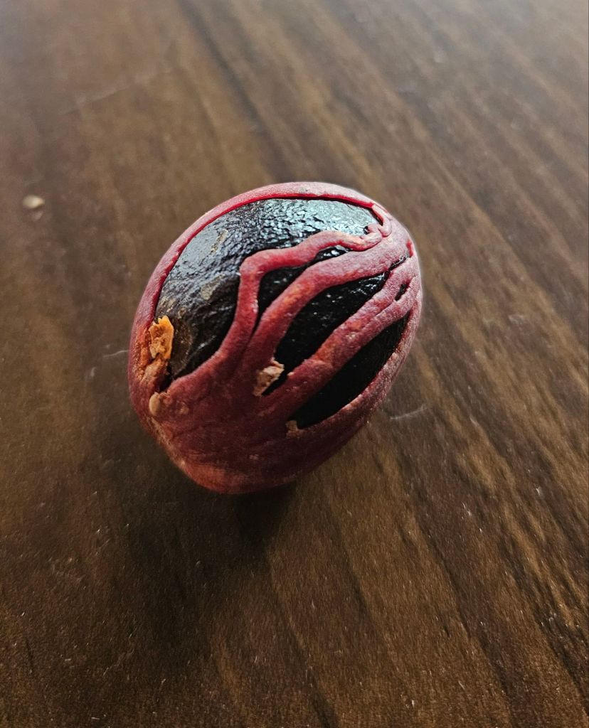 This is what a nutmeg “seed” (more like a nut) looks like when raw. The red outer layer is mace, which I have in my spice pantry but don’t know how to use. You soak the seed to remove the mace. Am I ever going to do that? Probably not, but it’s fun to know.