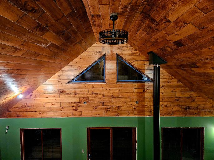 Warm and cozy, just as I hoped. It took two guys about five days to get it up. It's a lot of wood. The addition of the ceiling helps the Cabin at Many Moons finally look like a cabin. The wood installation isn't done yet, but I couldn't resist showing some pictures now. For those … Continue reading Ceiling’s Up!