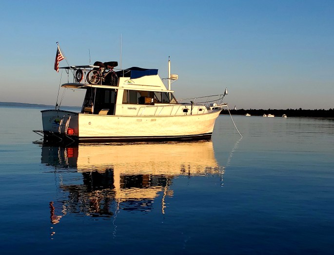 As I write this after dark from our anchorage close to shore, I see the lights of 14 other boats -- but this protected bay is so broad, we don't feel a bit crowded. On our port side, a lighthouse sends a warm yellow path down the water toward us. On our starboard side, the … Continue reading To S. Manitou Is. (Day 19)