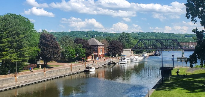 We're about to enter the Erie Canal. Exciting! We're tied up tonight at a free wall/floating dock in the town of Waterford, N.Y., some 25 miles north of last night's marina. Mainship Many Moons is tucked in cheek-by-jowl with many other boats waiting to go west into the canal or further north up the Hudson. … Continue reading Gateway to the Erie Canal