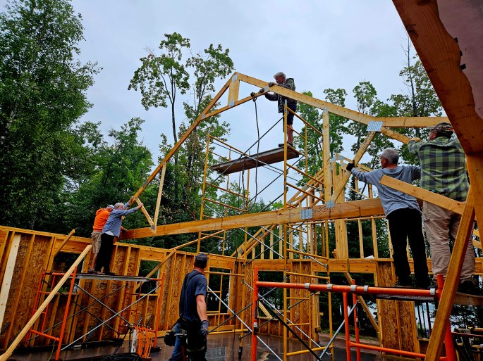 In the 1800s, "raise the roof" meant to make a ruckus. In the 1990s, it was a hit song. But in 2023, on the 46th parallel at Huron Bay, we are literally raising a roof. It's moving right along. The house trusses are all up and sheeting covers them. A weatherproof layer has been added … Continue reading Raising The Roof – Pt. 3
